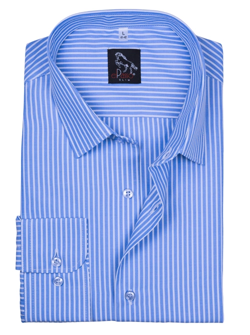 Elegancka wizytowa koszula męska, długi rękaw, niebieska w białe paski