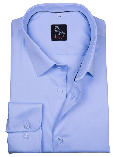 Elegancka wizytowa koszula męska, długi rękaw, niebieska z elastanem