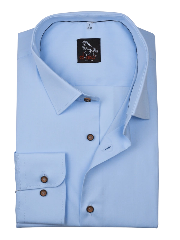 Koszula męska elegancka niebieska gładka z elastanem, granatowy guzik