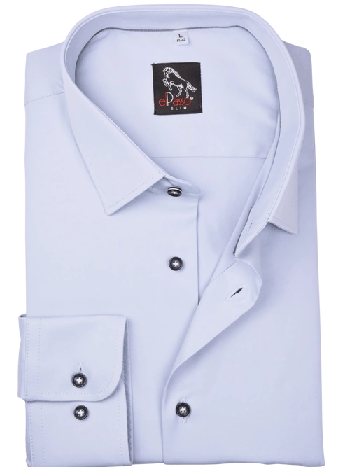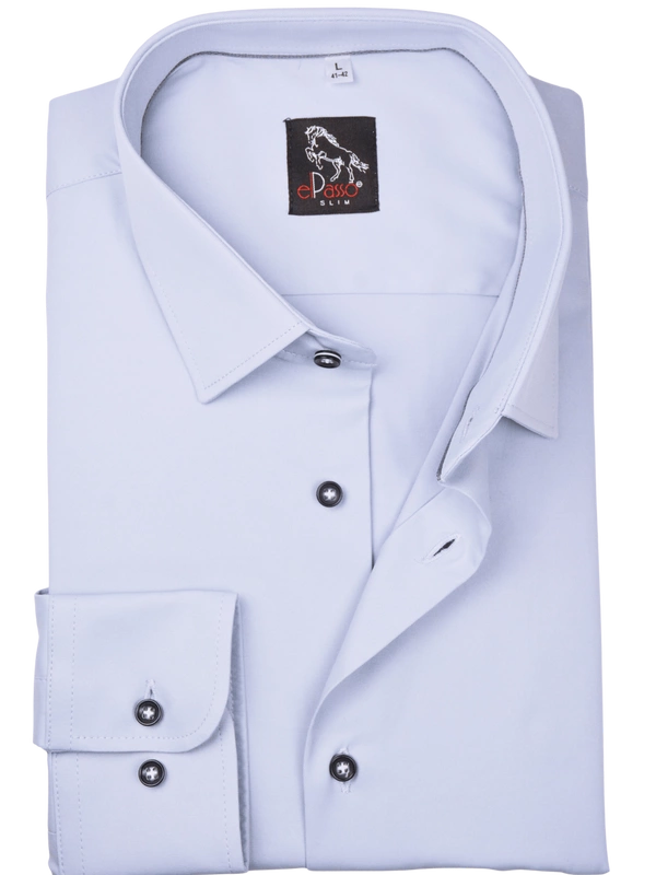 Koszula męska elegancka szara gładka z elastanem, granatowy guzik