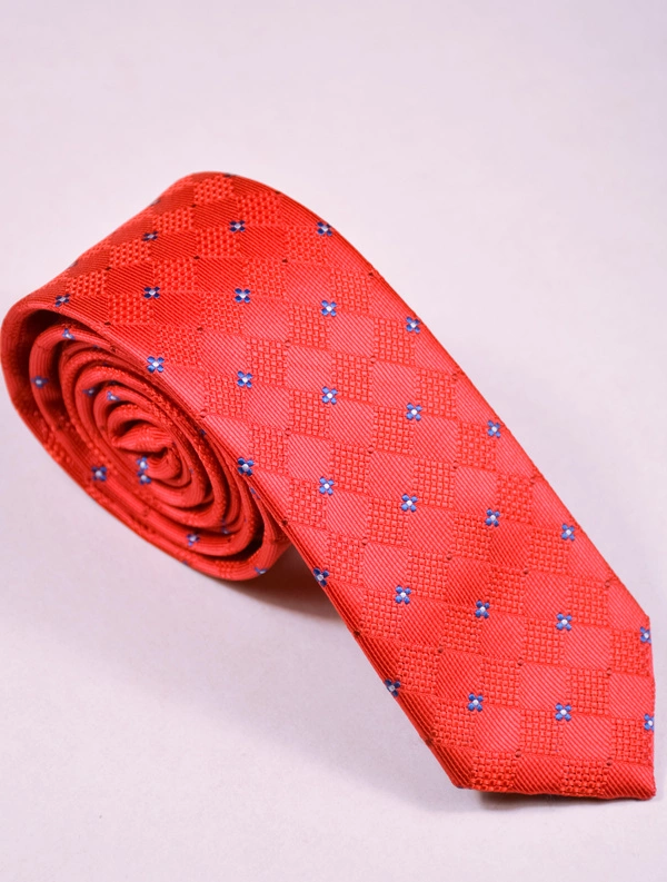 Czerwony krawat w drobne niebieskie kwadraty.