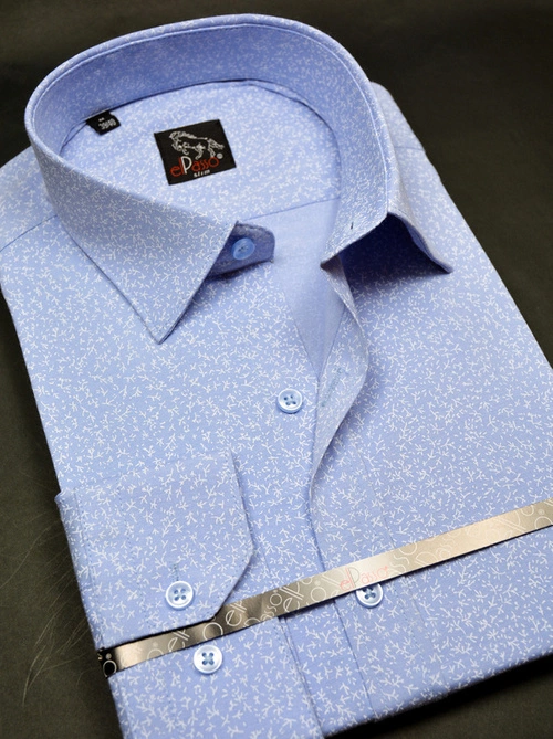 Koszula męska elegancka niebieska jednolita mikrowzór długi rękaw na guziki
