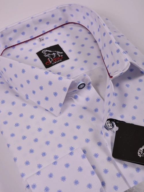 Koszula męska elegancka wizytowa biała grafika w niebieskie wzory długi rękaw na guziki