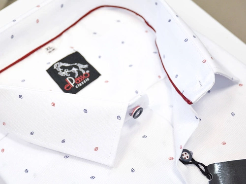 Koszula męska elegancka biała grafika w granatowe czerwone wzory długi rękaw na guziki