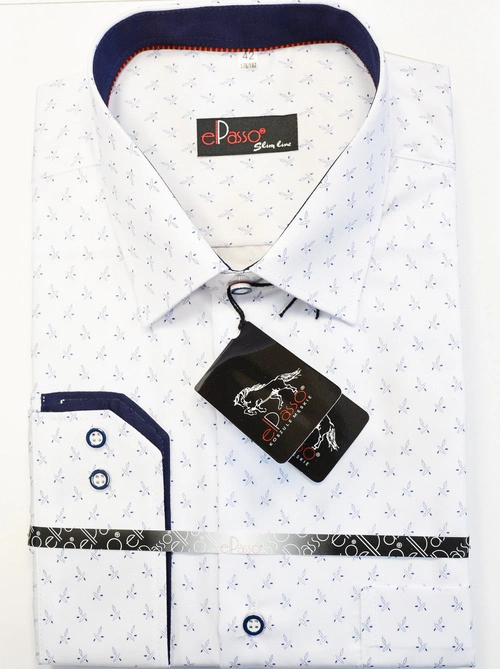 Koszula męska elegancka biała wizytowa grafika wzór w niebieski nadruk, długi rękaw na guziki.