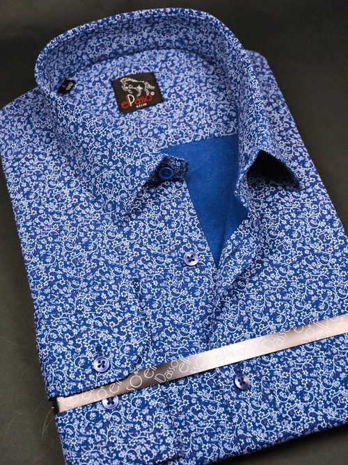 Koszula męska casual granatowa grafika wzór białe kwiaty długi rękaw na guziki elastan