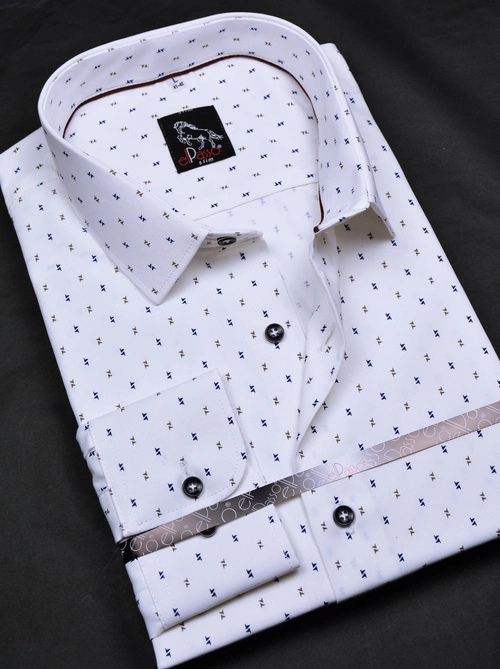 - Elegancka koszula z nadrukiem graficznym. Koszula z długim rękawem-skład 60% bawełna- 40% poliester- modny krótki kołnierzyk-mankiet zaokrąglony- regulowany na dwa guziki -krój Slim (taliowany) lub Classic-unikatowy deisgn.