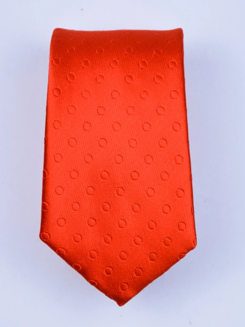 - Krawat czerwony w drobne czerwone groszki wykonany z lekko połyskującej tkaniny.