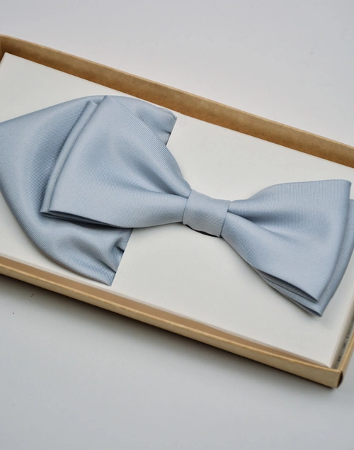- Mucha męska jasno stałowa gładka w komplecie z poszetką w tym samym kolorze, wykonana z lekko połyskującej tkaniny.