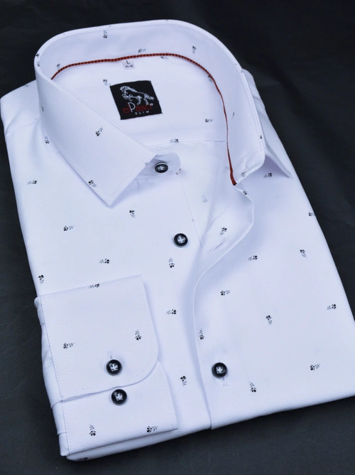 - Elegancka koszula z nadrukiem graficznym. Koszula z długim rękawem-skład 60% bawełna 40% poliester-modny, krótki, kołnierzyk-mankiet zaokrąglony, regulowany na dwa guziki -krój Slim (taliowany) lub Classic-unikatowy deisgn.