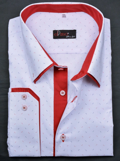 - Koszula z długim rękawem -skład 80% bawełna 20% poliester -modny podwójny kołnierzyk zapinany na guziki -mankiet zaokrąglony regulowany na dwa guziki -stójka wew. wykończona dekoracyjnym obszyciem -krój slim (taliowana) lub classic