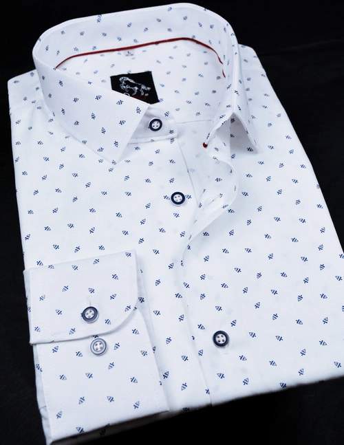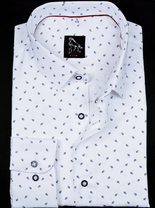 - Elegancka koszula biała z długim rękawem-skład 60% bawełna ma 40% poliester ,granatowa grafika, mankiet regulowany zapinany na dwa guziki, modny krótki kołnierzyk -krój Slim (taliowany) lub Classic unikatowy deisgn.
