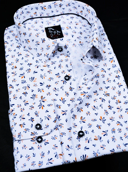 - Elegancka koszula biała z długim rękawem ,granatowa grafika, mankiet regulowany zapinany na dwa guziki, modny krótki kołnierzyk -krój Slim (taliowany) lub Classic unikatowy deisgn.