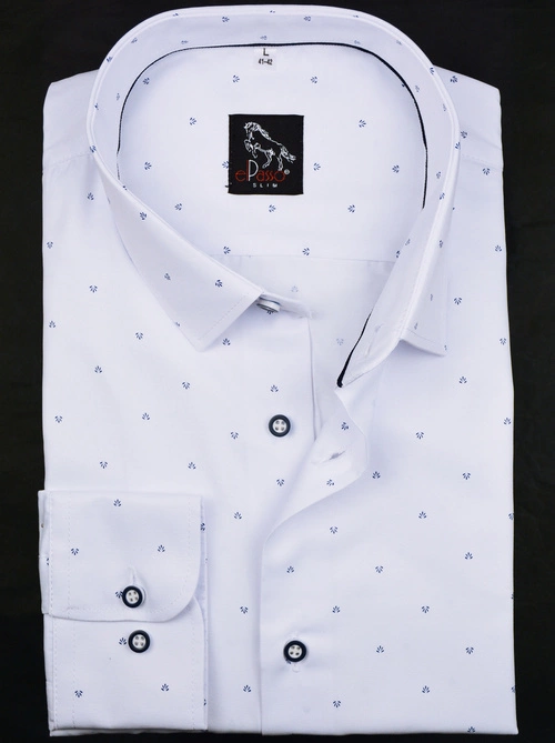 - Elegancka koszula biała z długim rękawem ,granatowa grafika, mankiet regulowany zapinany na dwa guziki, modny krótki kołnierzyk -krój Slim (taliowany) lub Classic unikatowy deisgn.