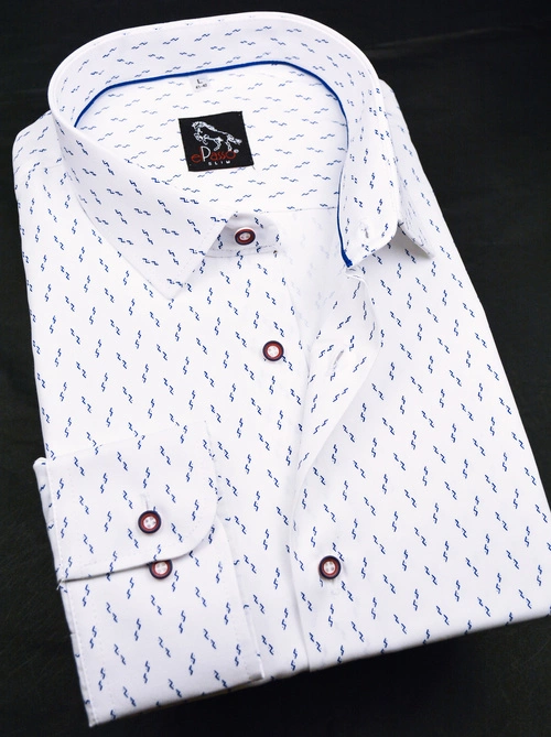 - Elegancka koszula biała z długim rękawem ,granatowa grafika, mankiet regulowany zapinany na dwa guziki, modny krótki kołnierzyk -krój Slim (taliowany) lub Classic unikatowy deisgn.