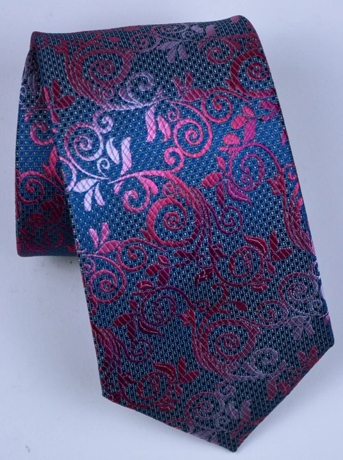 - Krawat granatowy w różowo bordowy motyw roślinny wykonany z lekko połyskującej tkaniny.