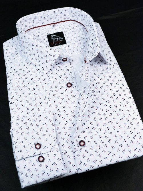 - Elegancka koszula z nadrukiem graficznym. Koszula z długim rękawem, modny, krótki, kołnierzyk-mankiet zaokrąglony, regulowany na dwa guziki -krój Slim (taliowany) lub Classic-unikatowy deisgn.