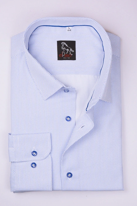 - Elegancka koszula męska biała z długim rękawem, niebieska grafika , modny krótki kołnierzyk, mankiet regulowany na dwa guziki -krój Slim (taliowany) lub Classic unikatowy deisgn.