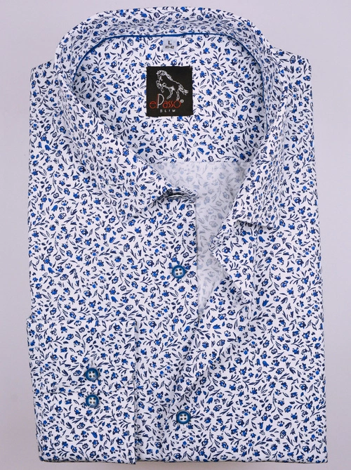 Elegancka wizytowa koszula męska, długi rękaw, biała w granatowe wzory