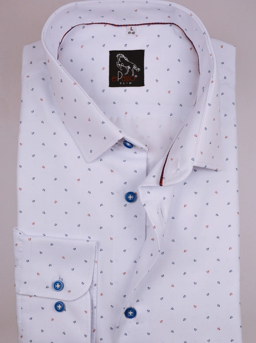 - Elegancka koszula męska biała z długim rękawem ,granatowo czerwona grafika , modny krótki kołnierzyk, mankiet regulowany na dwa guziki -krój Slim (taliowany) lub Classic unikatowy deisgn.