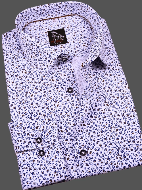 - Elegancka koszula męska biała z długim rękawem ,granatowo beżowa grafika , modny krótki kołnierzyk, mankiet regulowany na dwa guziki -krój Slim (taliowany) lub Classic unikatowy deisgn.
