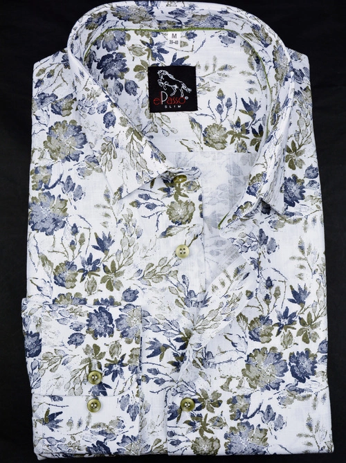 Koszula męska bawełniana, długi rękaw, biała w oliwkowy i granatowy wzór