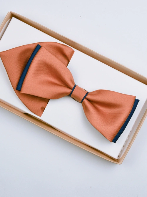 - Mucha męska Granatowo-miodowa, pomarańczowa gładka w komplecie z poszetką w tym samym kolorze, wykonana z lekko połyskującej tkaniny.