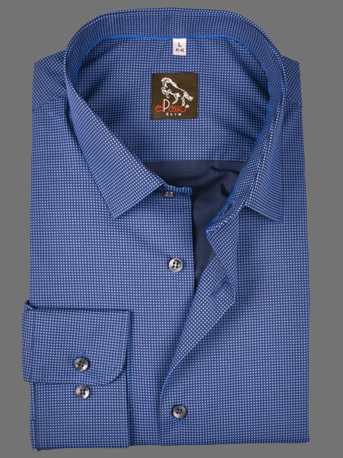 - Elegancka koszula elPasso – granatowa z subtelną grafiką, wykonana z wysokiej jakości tkaniny. Modny, krótki kołnierzyk i mankiet na dwa guziki stylowe i wygodne. Dostępna w kroju Slim (taliowanym) lub Classic , wyróżniającym się unikalnym designem