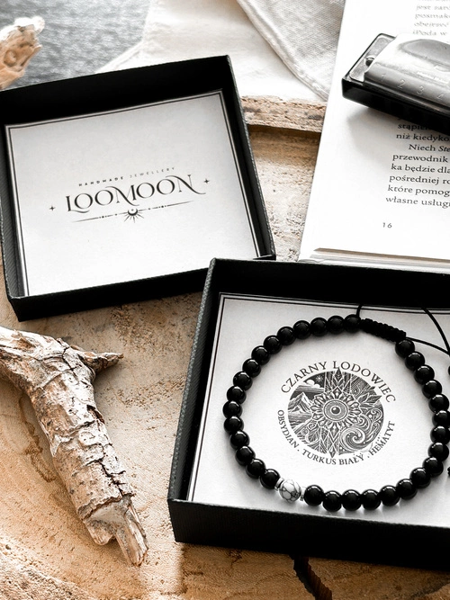 - Bransoletka marki LOOMOON to wyjątkowe połączenie ochrony, harmonii i siły wewnętrznej. Wykonana z prawdziwych kamieni naturalnych – obsydianu, białego turkusu i hematytu, wspiera stabilność emocjonalną, usuwa negatywną energię i dodaje pewności siebie.