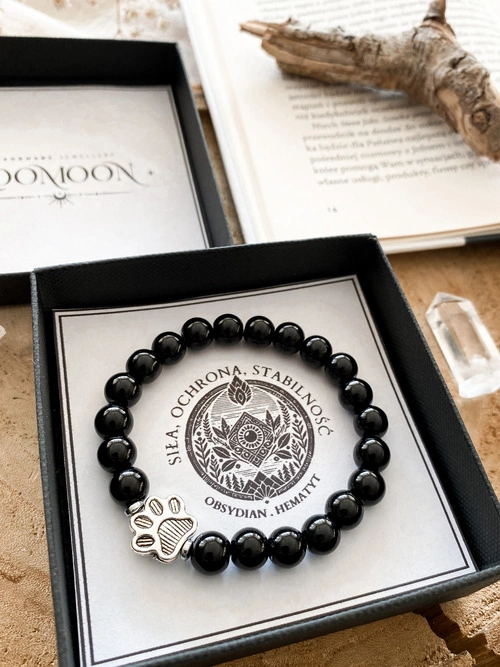 Bransoletka marki LOOMOON to symbol ochrony, siły i lojalności. Wykonana z naturalnych kamieni – obsydianu i hematytu, wspiera stabilizację emocjonalną, pewność siebie oraz ochronę przed negatywną energią. Centralnym elementem jest metalowy charms w kształcie psiej łapy , który symbolizuje wierność, lojalność i nieograniczoną miłość do zwierząt.
