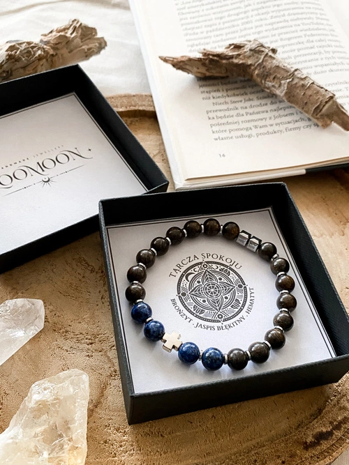 - Bransoletka marki LOOMOON to symbol siły, ochrony i harmonii. Wykonana z naturalnych kamieni – bronzytu, jaspisu błękitnego i hematytu, wspiera równowagę emocjonalną, wewnętrzny spokój i stabilizację psychiczną.