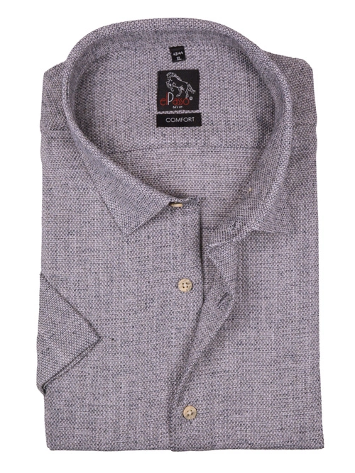 - Stylowa koszula męska z krótkim rękawem, wykonana z lekkiego, przewiewnego materiału – doskonała na lato. Grafitowo-szary kolor z subtelną fakturą, modny kołnierzyk i jasne guziki tworzą elegancki wygląd. Dostępna w kroju Slim lub Classic.