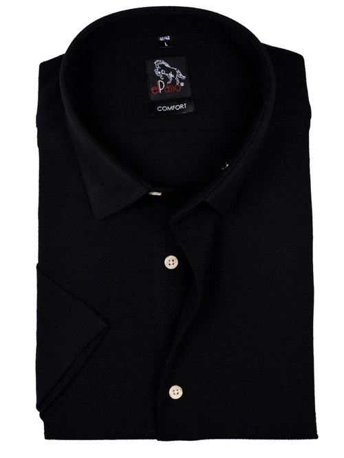 - Stylowa koszula męska z krótkim rękawem, wykonana z lekkiego, przewiewnego materiału – doskonała na lato. Czarny kolor z subtelną fakturą, modny kołnierzyk i jasne guziki tworzą elegancki wygląd. Dostępna w kroju Slim lub Classic.