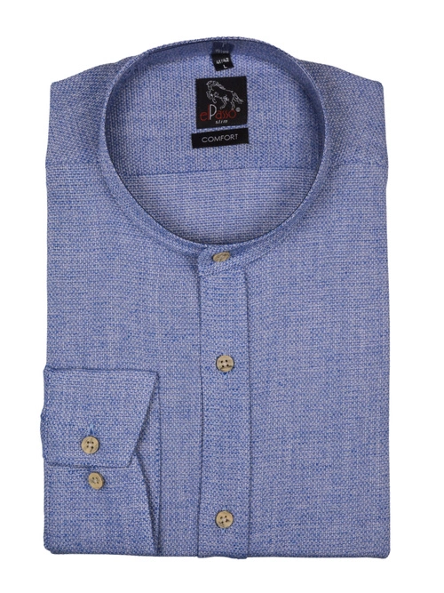 - Koszula męska z komfortowej, przewiewnej tkaniny w kolorze niebieskim z melanżową strukturą. Posiada stójkę zamiast klasycznego kołnierzyka, jasne guziki i mankiety zapinane na dwa guziki. Nowoczesny fason i wygoda idealna na letnie dni